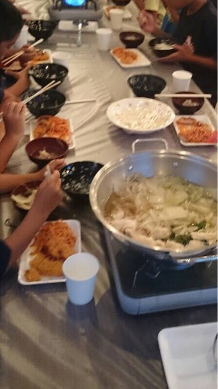 夕食はご飯にカツ、スパゲッティ、鍋と〆のうどん…ボリューム満点でしたがペロリと食べている子供が多かったです。