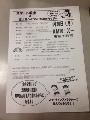 明日より、「スケート教室&富士急ハイランド」の申込み開始